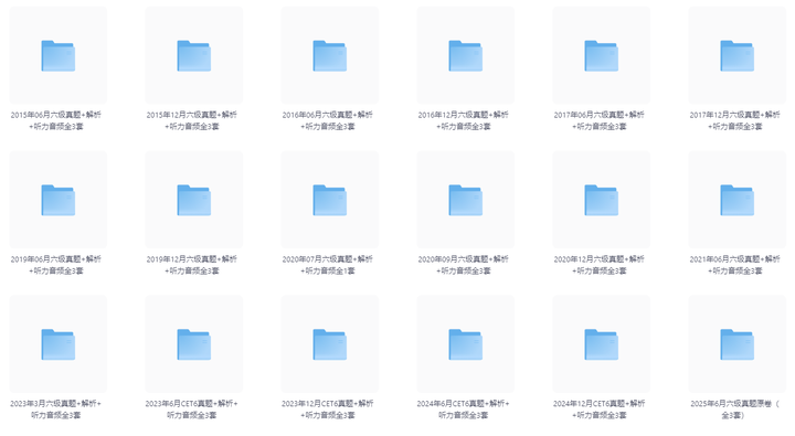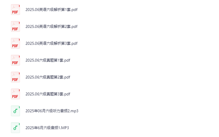 备考英语六级的同学别愁!听力跟不上、阅读长难句卡壳、写作没思路?刷透真题才是破局关键!这份 2015-2025 年英语六级真题合集超实用,10 余年完整真题全覆盖,每道题配逐题解析,听力部分含完整音频 + 原文,可直接播放对照。刷题能精准摸透命题规律 —— 比如听力新闻 / 对话高频场景词、阅读答案定位技巧、翻译高频话题表达,解析里都清晰标注。PDF 格式可打印,听力支持手机 / 电脑播放,日常刷题、考前模拟都方便。不管是补基础、练技巧,还是冲刺 500+,这份资料都能用上,速领备战六级!
